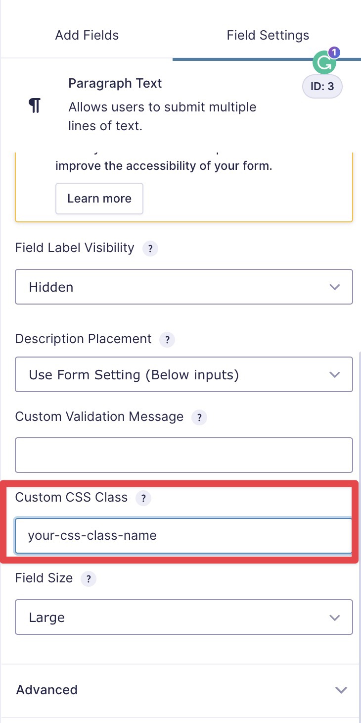 The best way would be to give a specific class name to all your fields, which will be used to get the custom CSS. Suppose you’d like to assign the “position: fixed” to multiple fields from multiple forms. You could set a special class to all those fields (ex: fixedtop). You’ve to go to the Field Settings → Appearance → Custom CSS Class to assign a new custom class name.